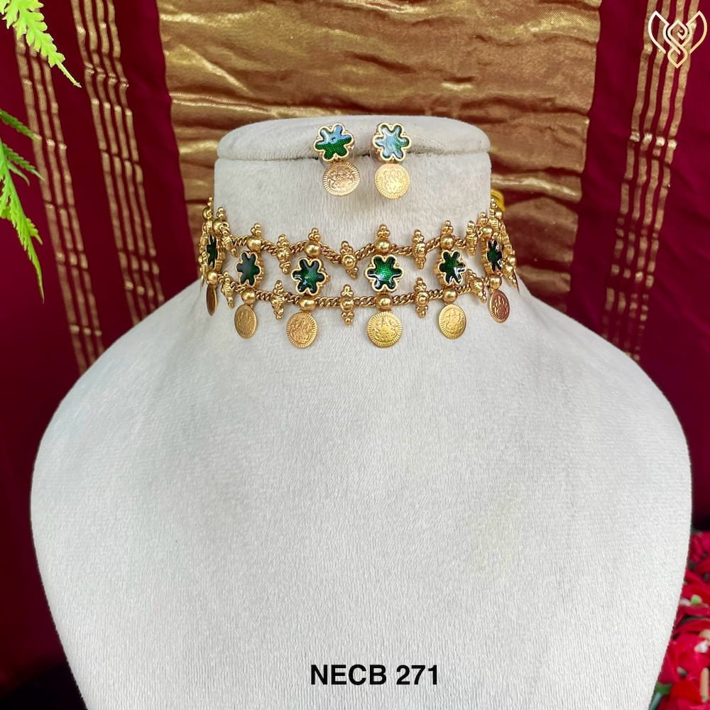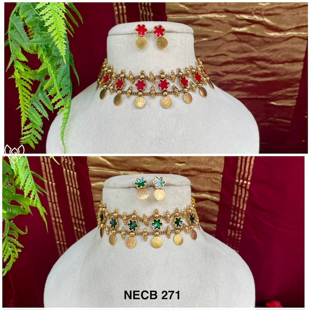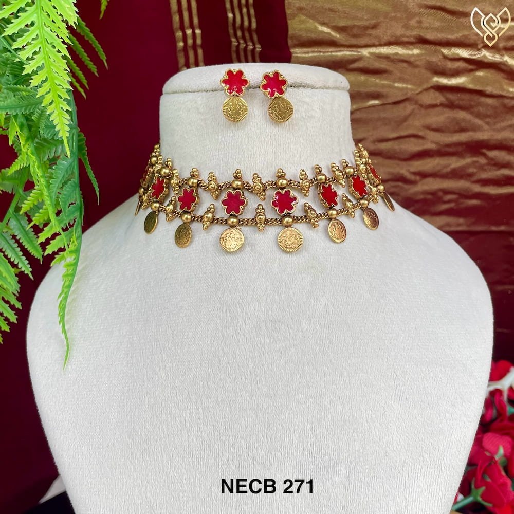 Antique flower coin choker wih studs in red and green colours