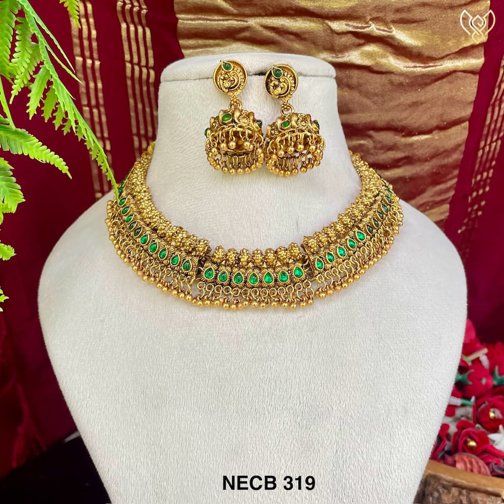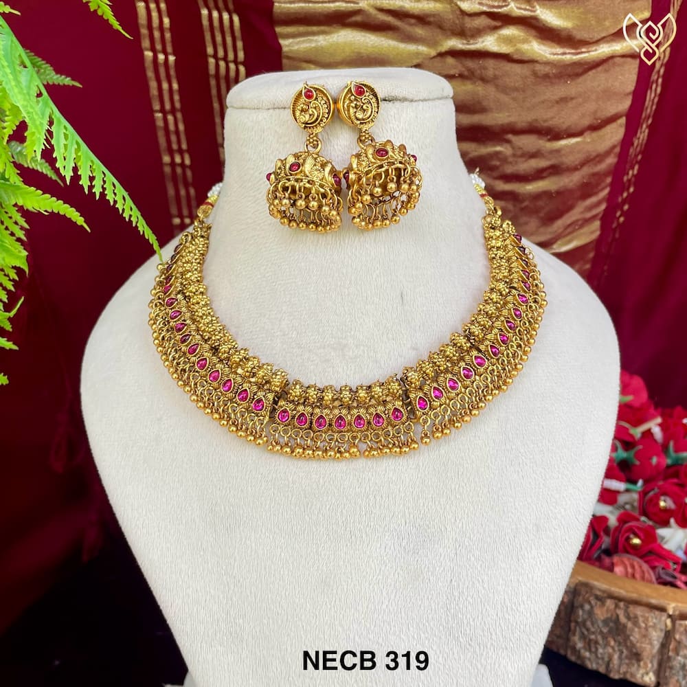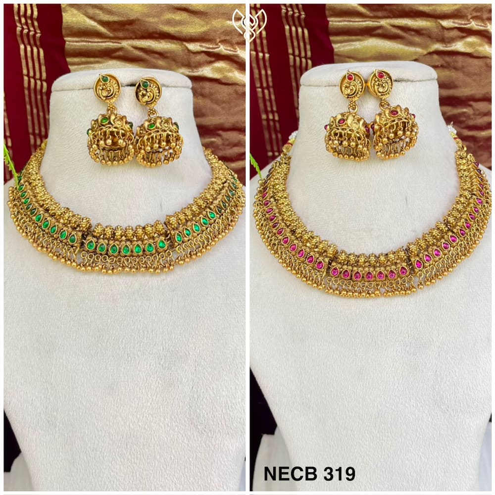 Premium antique non idol gungroo necklace in pinkish ruby and green with jhumka