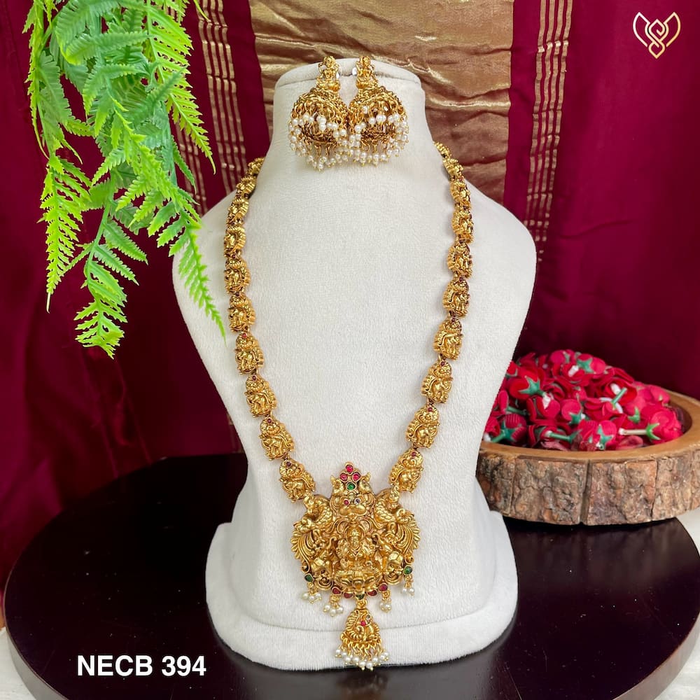 Antique nagas lakshmi pendant long haram with peacock chain and jhumka with pearl hangings